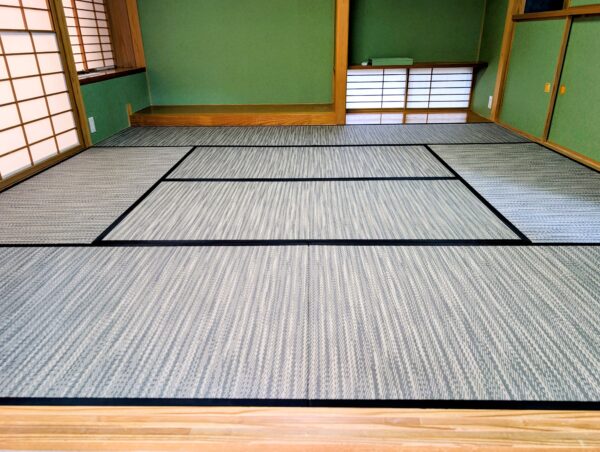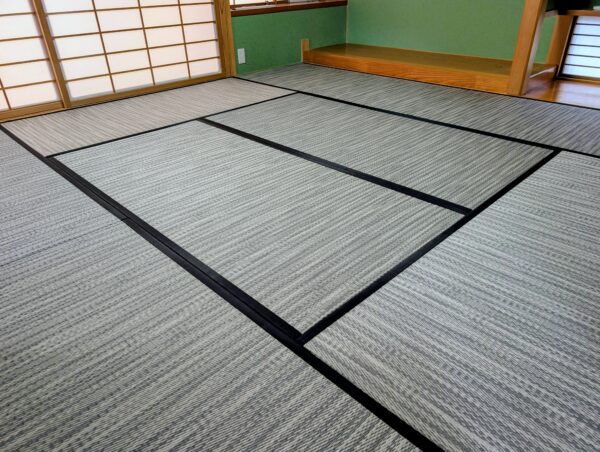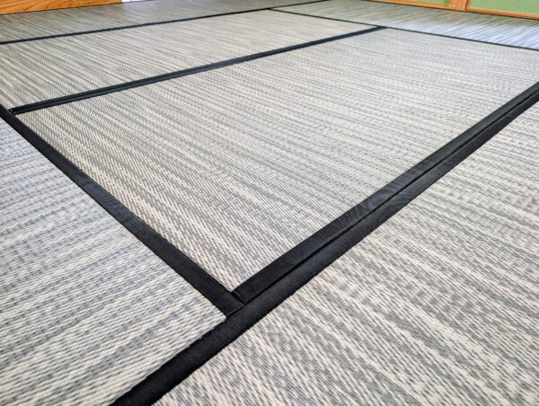 従来のいぐさ畳とは違って、淡いグレーの畳表に黒い畳縁がピシッと効いてます。